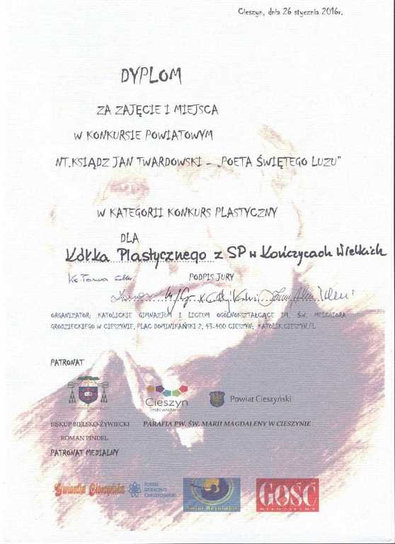 W Powiatowym Konkursie Recytatorskim "KSIĄDZ JAN TWARDOWSKI - POETA ŚWIĘTEGO LUZU" zorganizowanym przez Katolickie Gimnazjum oraz Liceum Ogólnokształcące im. św.  Melchiora Grodzieckiego w Cieszynie pięknie zaprezentowały się trzy nasze uczennice: Maria Kopala  z kl. V, Emilia Matuszek z kl. V (melorecytacja) oraz Justyna Staniek z kl. VI. Natomiast uczennice kółka plastycznego wspaniale zilustrowały wiersz ks. Jana Twardowskiego i zajęły I miejsce! Wszystkim uczestnikom konkursu dziękujemy za udział, a zwycięzcom gratulujemy.